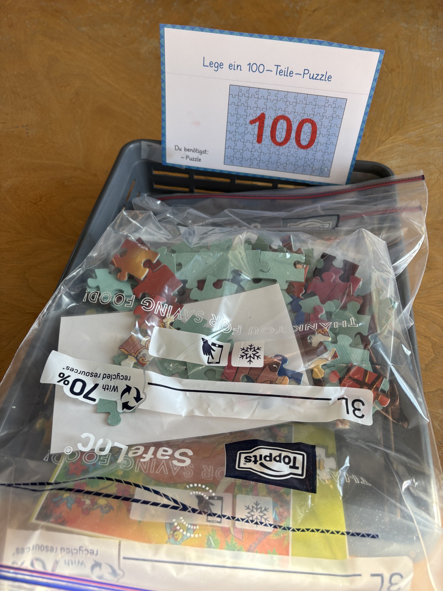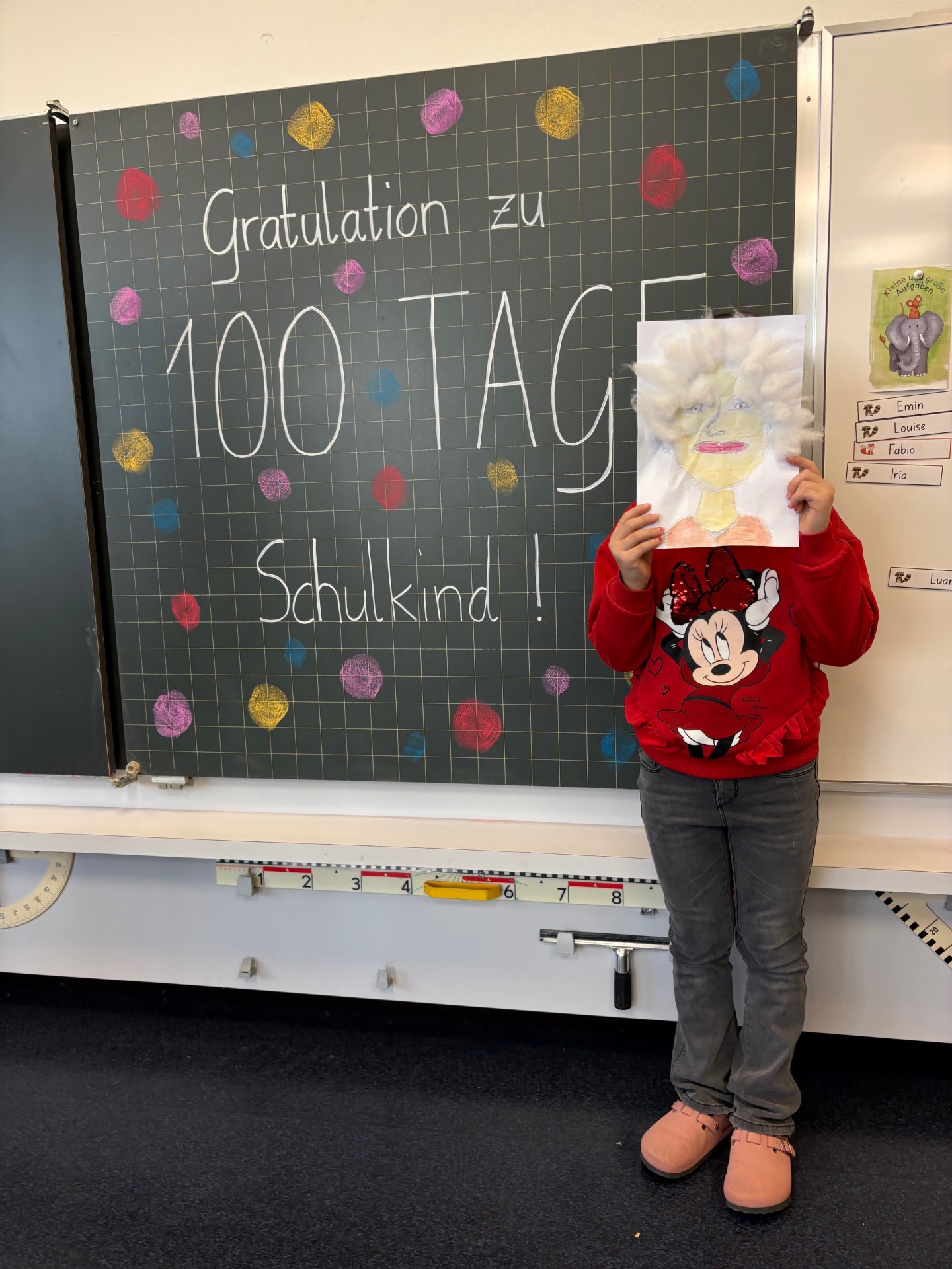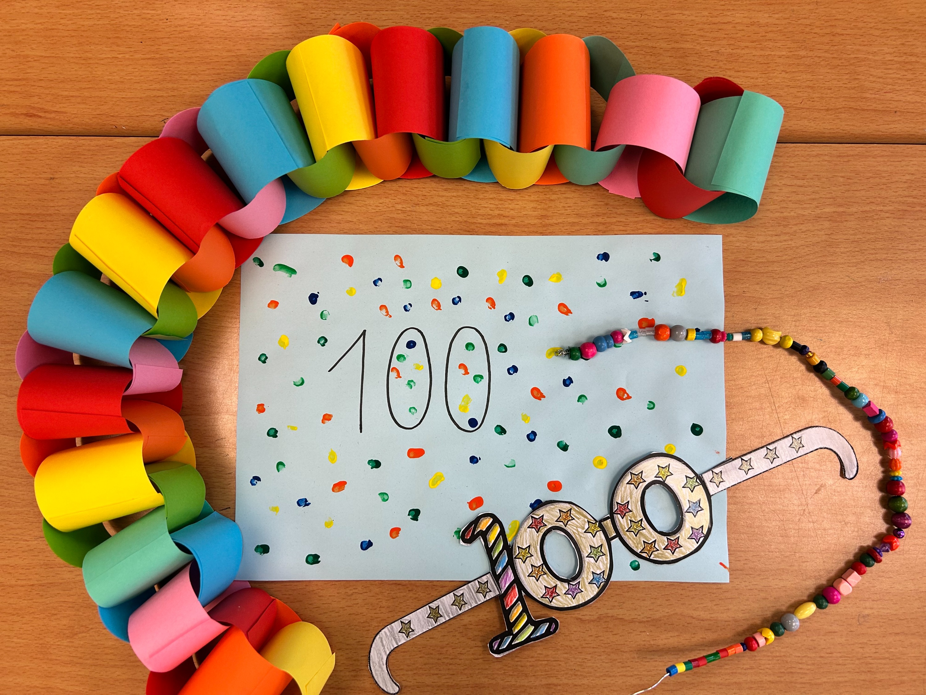 Gemeinsam veranstaltete die Klasse ein kleines Fest, zu dem auch die Eltern herzlich eingeladen waren. Mit verschiedenen Aktivitäten, Spielen und Bastelangeboten rund um die Zahl 100 wurde gefeiert! Es konnten 100er-Puzzles gemacht werden, 100 Perlen durften aufgefädelt werden, eine Girlande mit 100 Papieren wurde gebastelt und die Kinder überlegten sich, wie sie wohl im Alter von 100 Jahren aussehen werden.