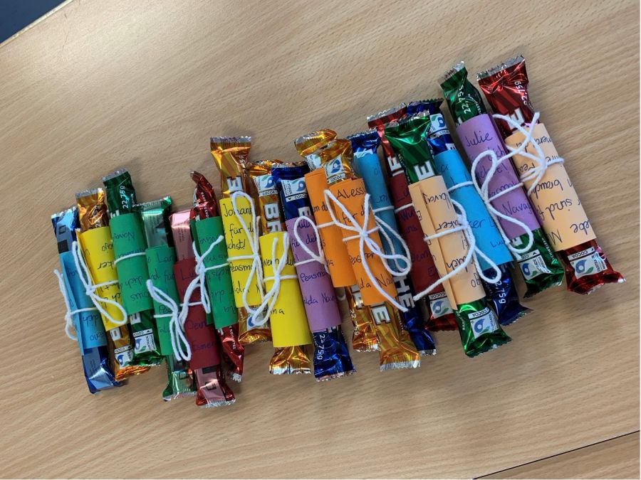 Um ihre Präsenz in Erinnerung zu rufen, führten die Peacemaker in der 10-Uhr-Pause anfangs Juni eine süsse Aktion auf dem Pausenplatz durch: Alle Peacemaker der 3. bis 6. Klasse schrieben im Vorfeld eine persönliche Botschaft an alle Kinder des Schulhauses und wickelten diese um ein Schoggistängeli. Die Aktion war ein voller Erfolg!
