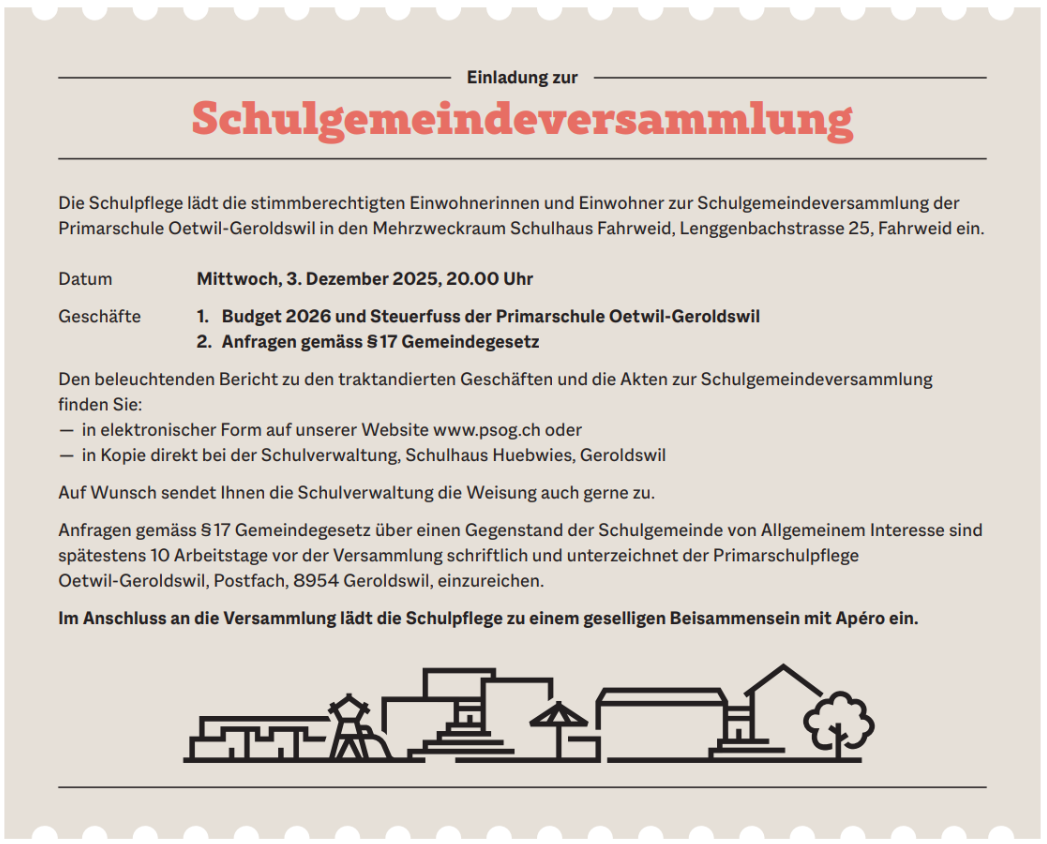 Schulgemeindeversammlung - Mittwoch, 3. Dezember 2025, 20:00 Uhr