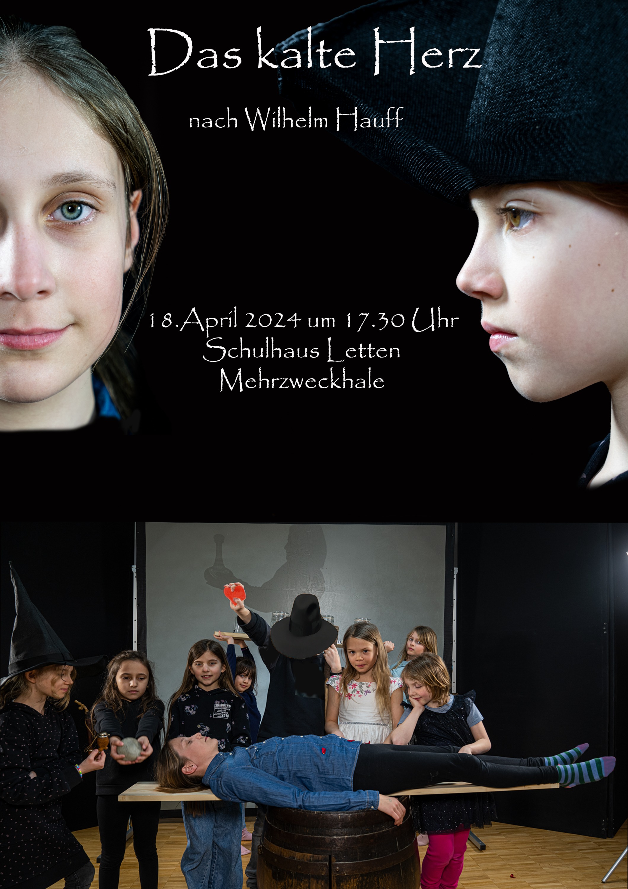 Die Schülerinnen des Theaterkurses führen am 18.04.2024 um 17.30 Uhr in der Mehrzweckhalle Letten das Märchen "Das kalte Herz" von Wilhelm Hauf auf.